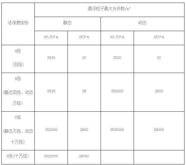 中國GMP(藥品生產質量管理規范2010)的凈化車間空氣潔凈度標準表